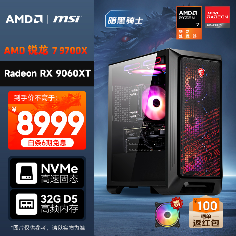 - **核心参数**:侧重高端硬件,如锐龙 7 9700X、RX 9060XT 显卡、32G 高频内存,强调“能扛大型游戏、设计软件”的性能。