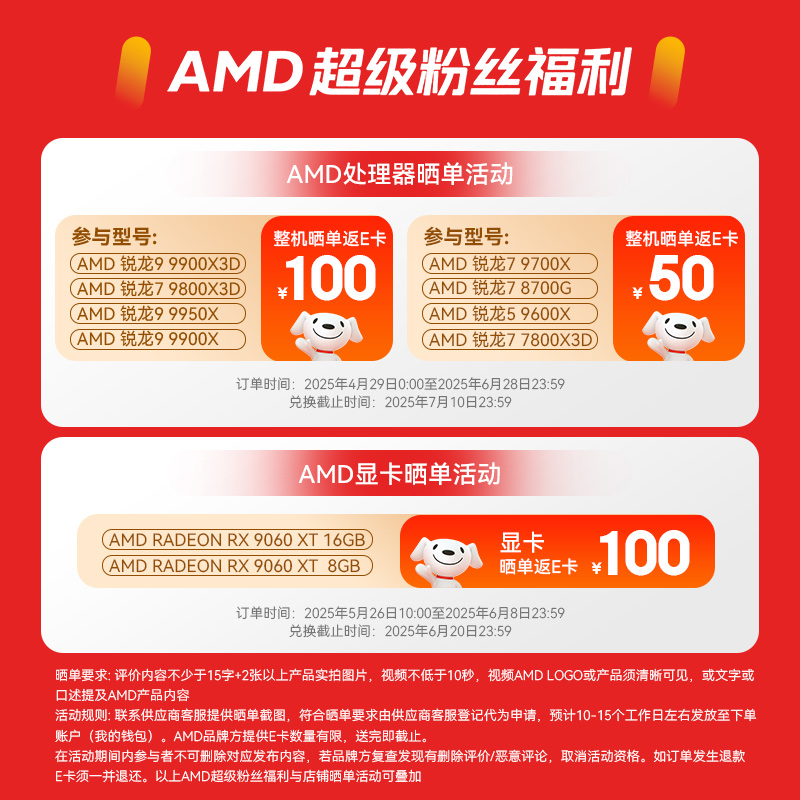 这是 **AMD 面向粉丝推出的晒单返 E 卡促销活动海报**,核心是通过 “晒单奖励” 驱动用户购买、传播,设计上围绕 “清晰传递活动规则,刺激参与” 展开,拆解如下: