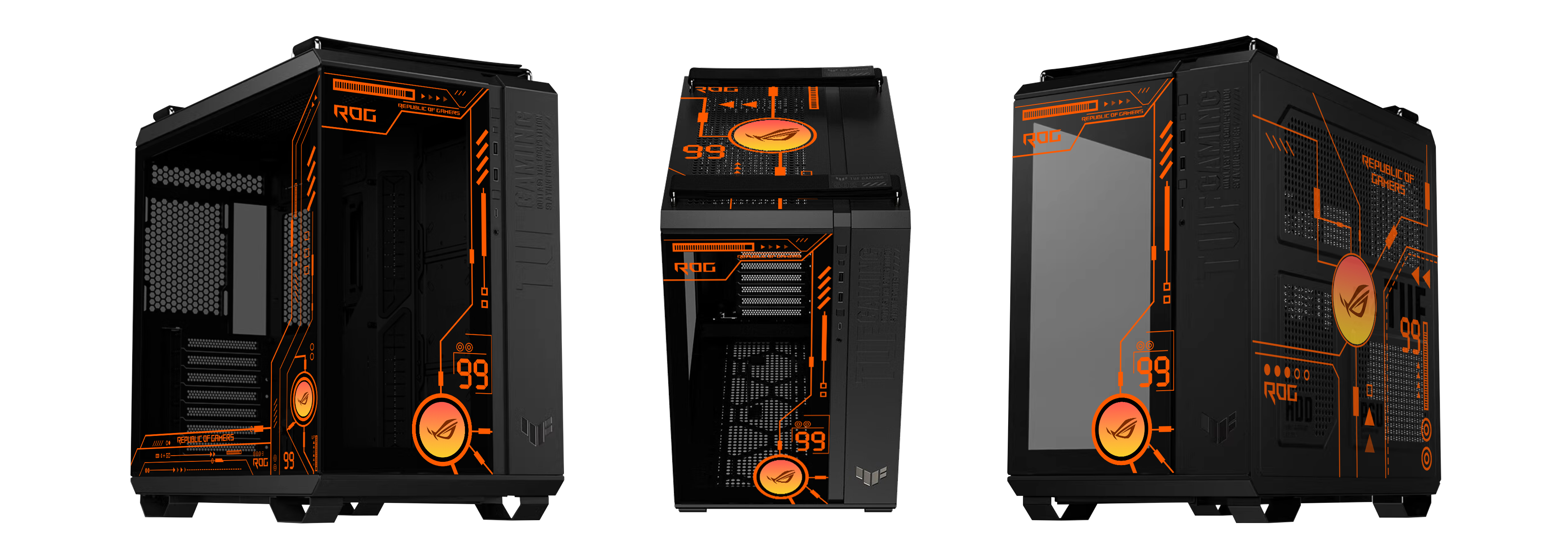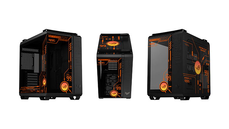 以黑色为基底(营造神秘、沉稳的科技感),搭配高饱和度橙色线条 / 标识(模拟能量流动的炽热感),像机甲战士的动力回路,“99”“ROG” 等符号,既是品牌印记,也暗示性能满格,呼应 “能量核心” 主题;