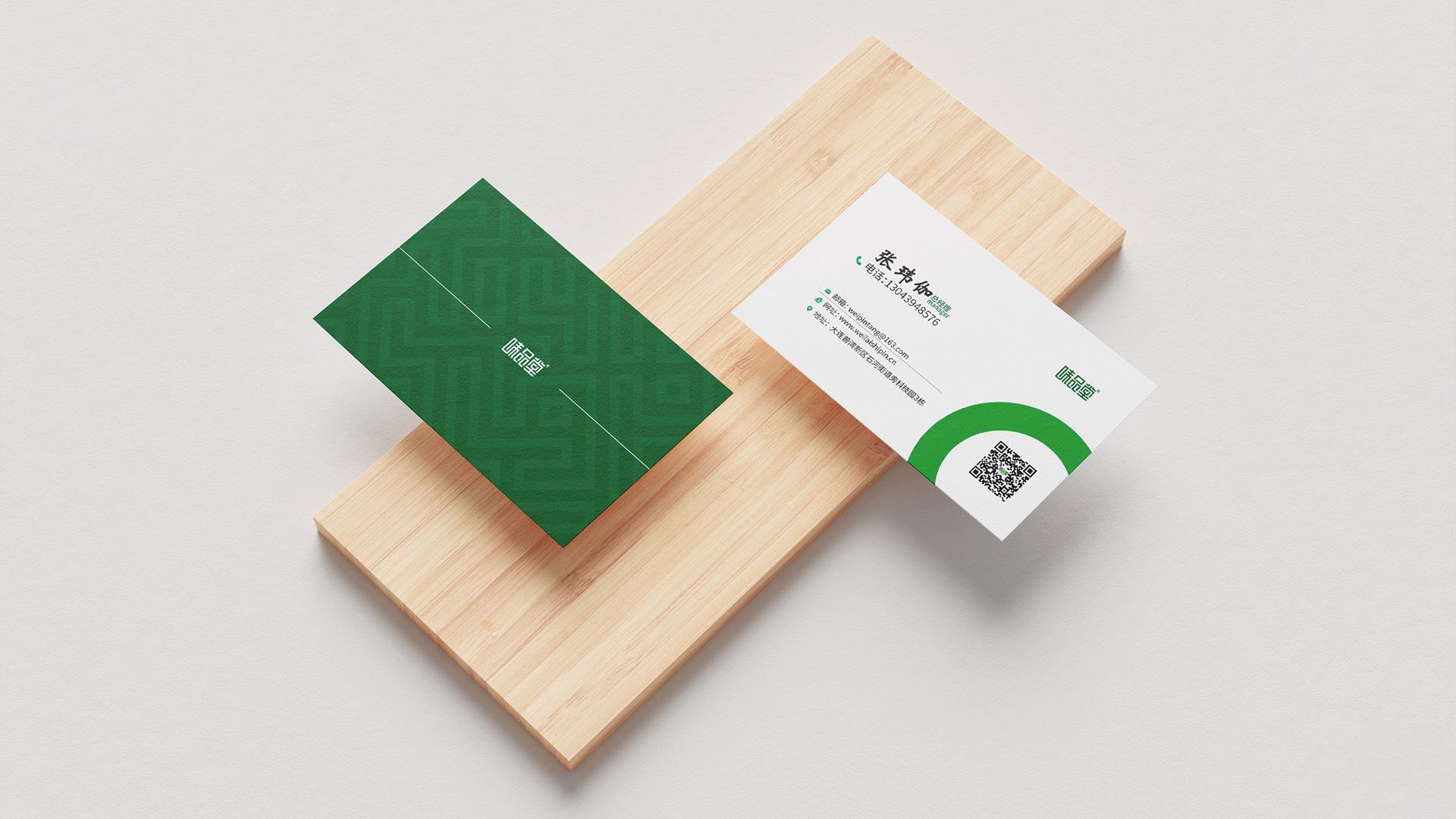 以品牌色绿色为视觉主符号,背面满铺 + 纹理加持,把“味品堂” 三个字 “种” 进浓郁的品牌色里;正面用白底色 “收住” 视觉,让姓名、电话等信息清晰好读,一放一收间,既强化品牌记忆,又保证名片最核心的 “联络功能” 不被干扰。